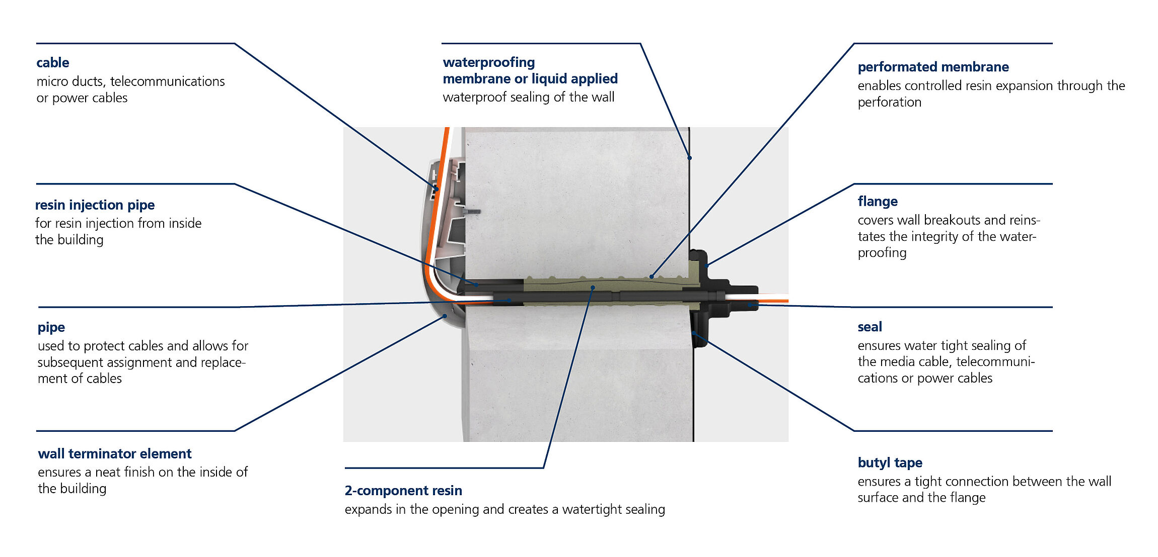 It applies to different types of walls: concrete walls, brick walls, etc. Without this membrane, the expansion resin would flow out uncontrollably, which would not ensure optimal sealing. The flange, which is attached to the outer wall, serves as a formwork aid to keep the expansion resin in the opening.