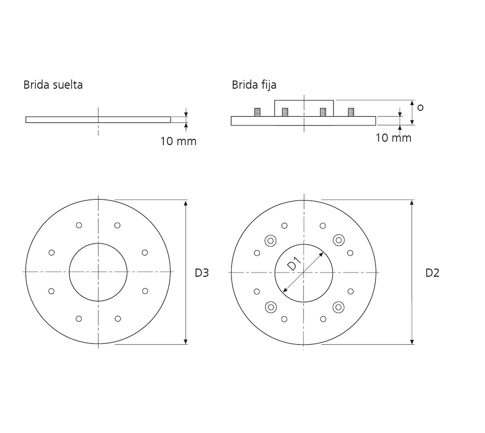 D1: Revestimiento de tubería Øi, D2: Brida fija Ø, D3: Brida suelta Ø