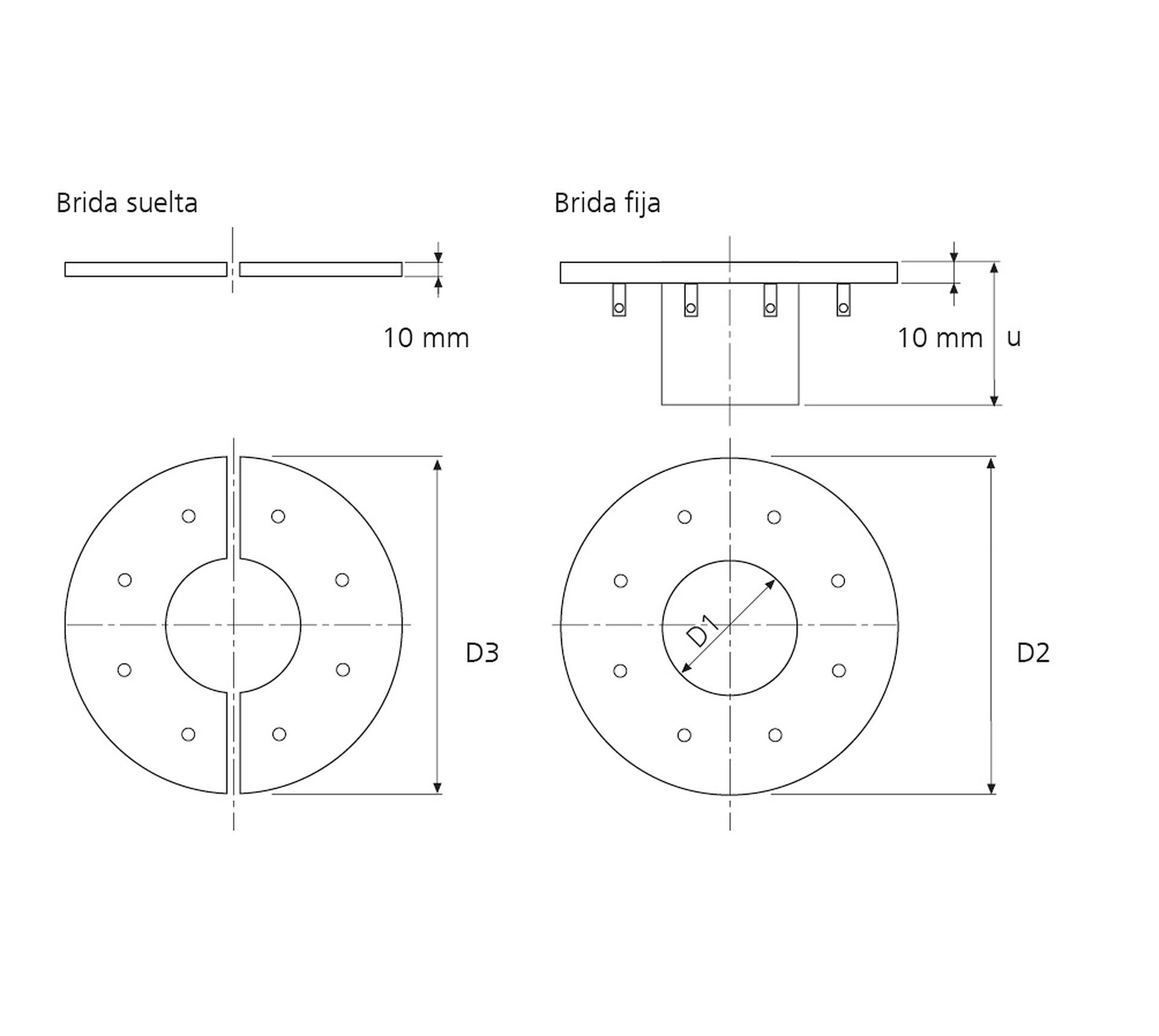 D1: Revestimiento de tubería Øi, D2: Brida fija Ø, D3: Brida suelta Ø